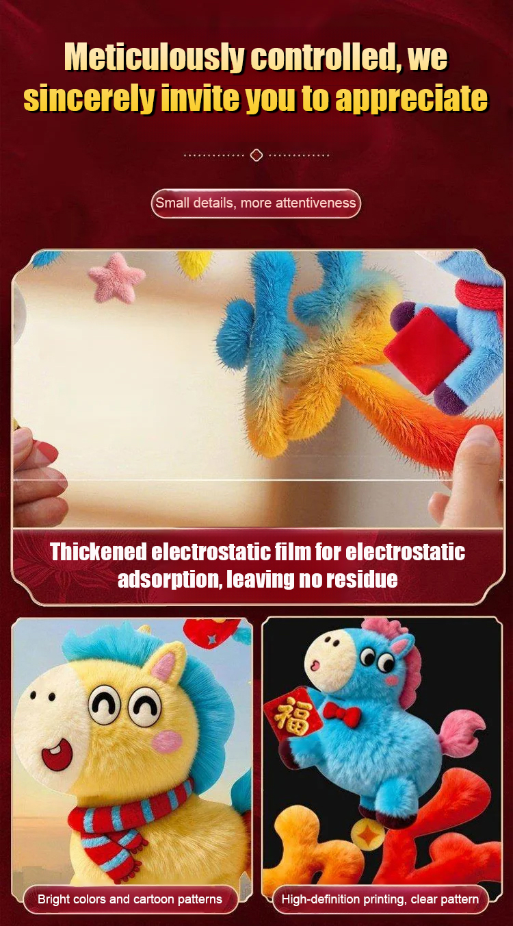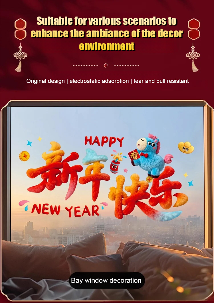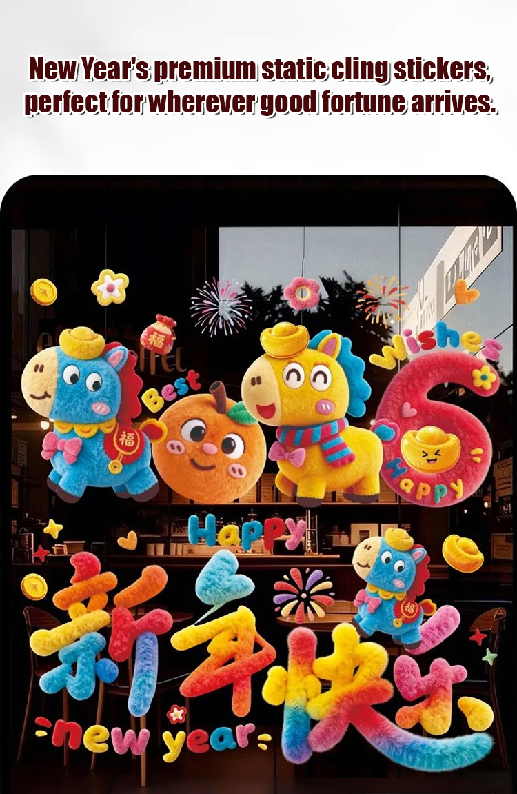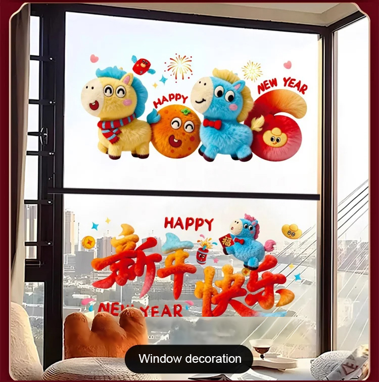 2026 New Year Glass Stickers Cartoon Plush Cute Door and Window Stickers